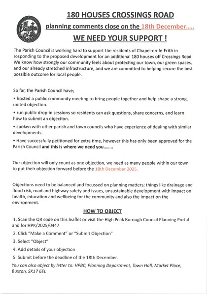The Parish Council is hosting a public community meeting to bring residents together to help shape a strong and informed objection to the proposed application for an additional 180 houses at Crossings, Chapel-en-le-Frith. Read more >>