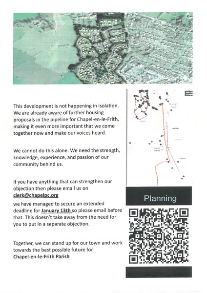 The residents of Chapel-en-le-Frith have given the Parish Council a clear mandate to oppose the proposed development for an additional 180 houses at Crossings. It is therefore working hard to support residents in responding to the proposed development, not just as a collective but as individuals as well. We know how strongly our community feels about protecting our town, our green spaces, and our already stretched infrastructure, and we are committed to helping secure the best possible outcome for local people. Read more >>