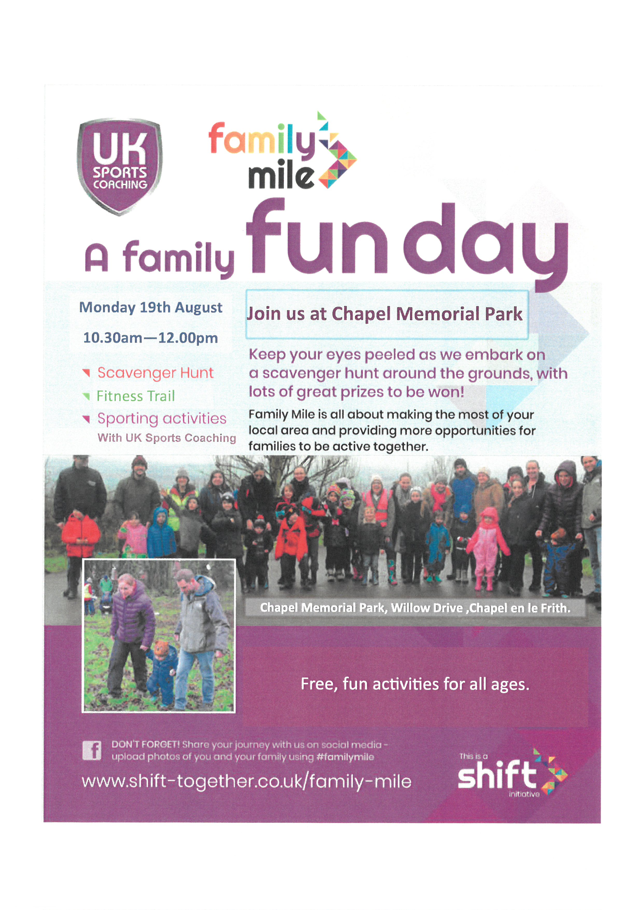 A family fun day will be held in the Memorial Park, Chapel-en-le-Frith on Monday 19th August 2019 from 10.30am - 12pm